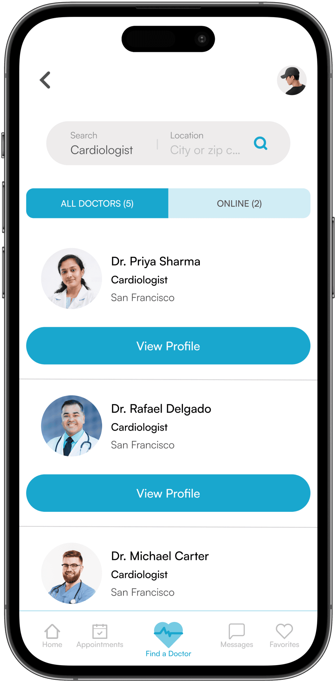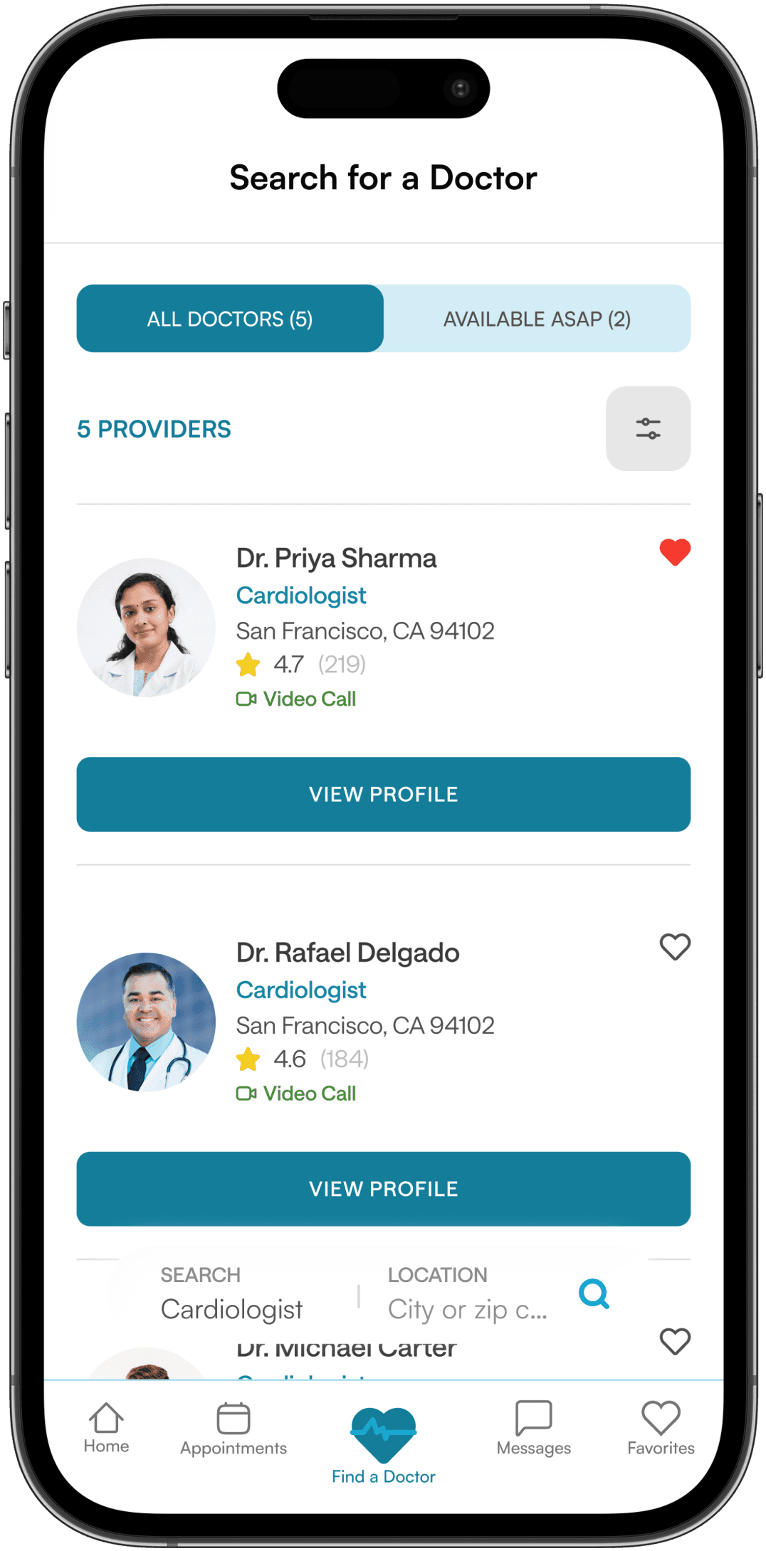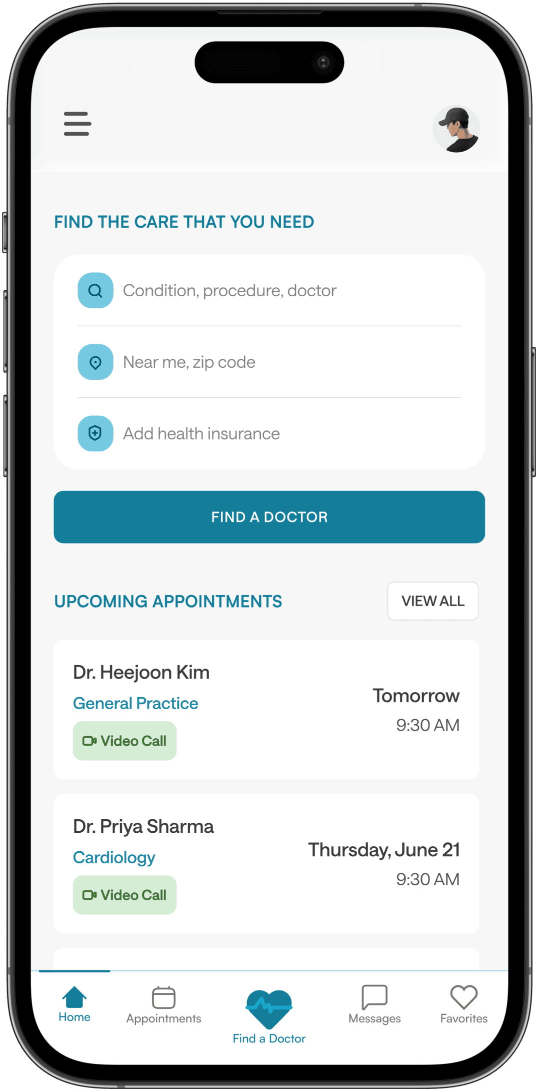 The search screen gives users a streamlined way to find the right healthcare providers based on their needs
