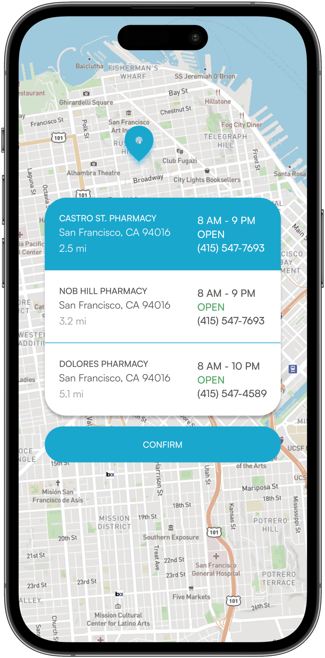 List of available pharmacies shown under input, including contact info and open/closed times.