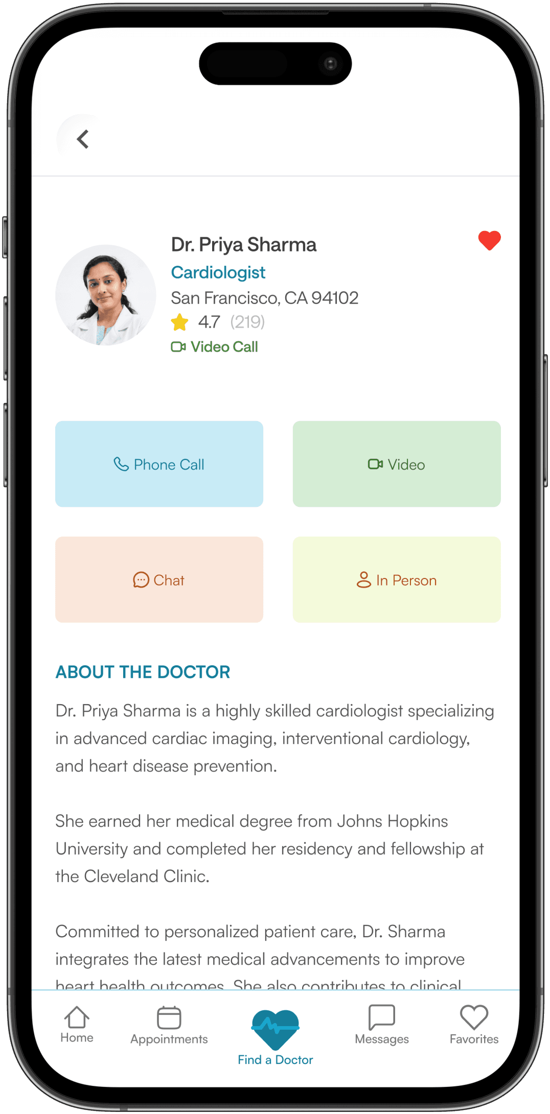 The doctor profile provides users with detailed info about healthcare providers and the different appointment options available
