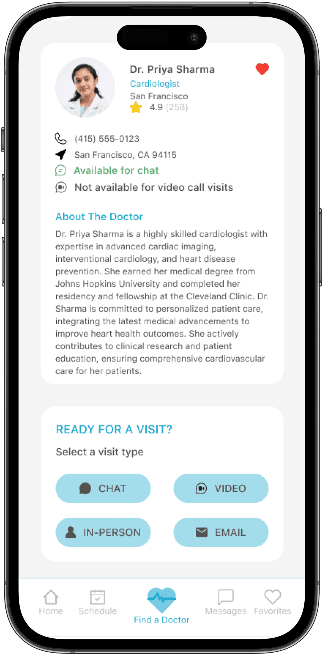 Users could connect in four clear ways: chat, email, in person, or video. This made it easier to choose the care they needed and find the right doctor.